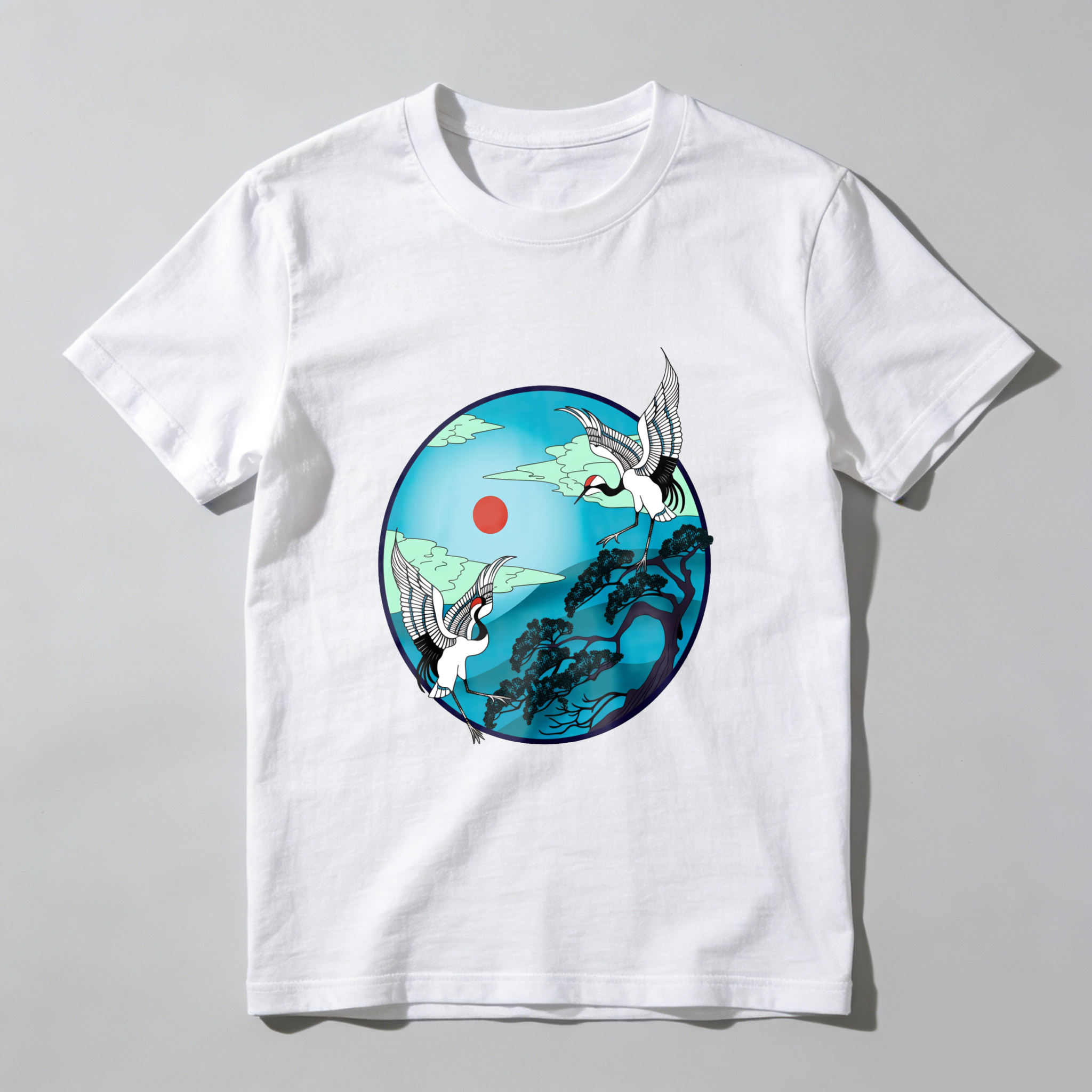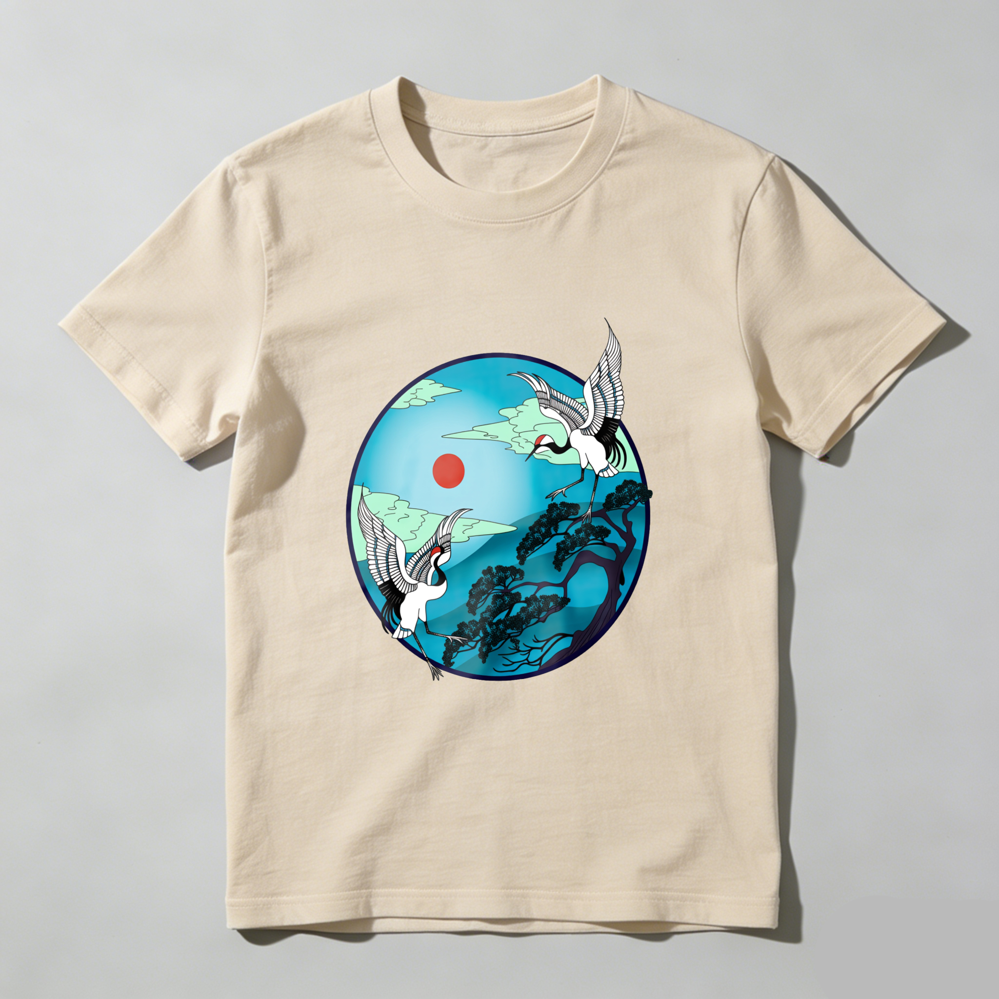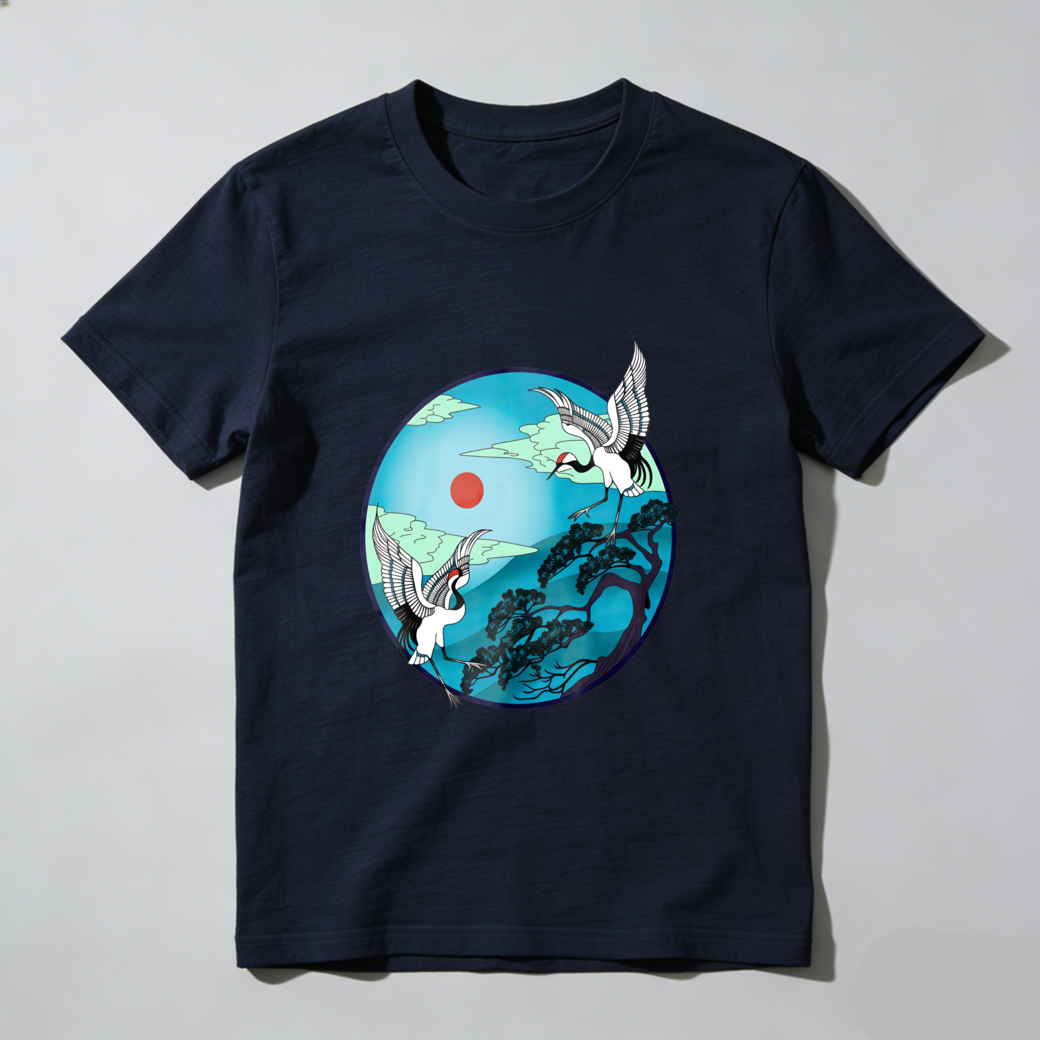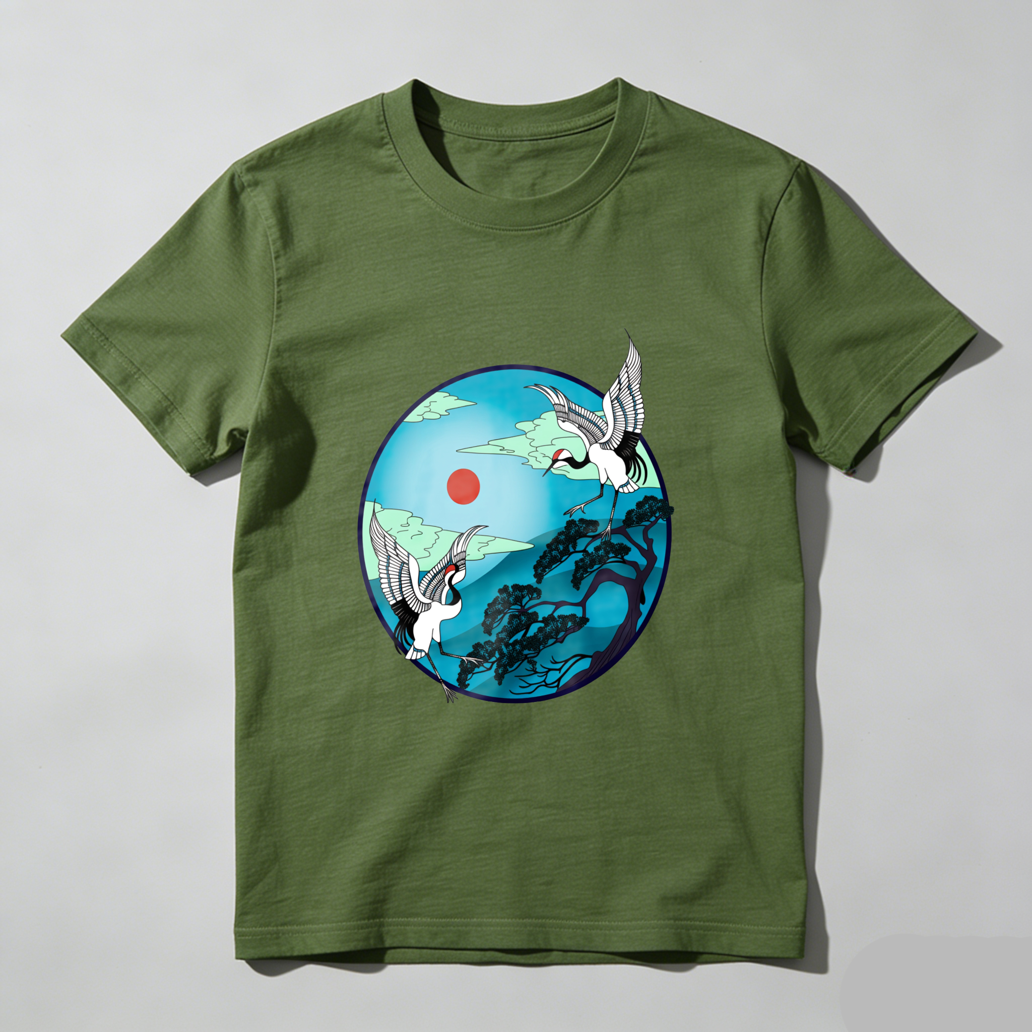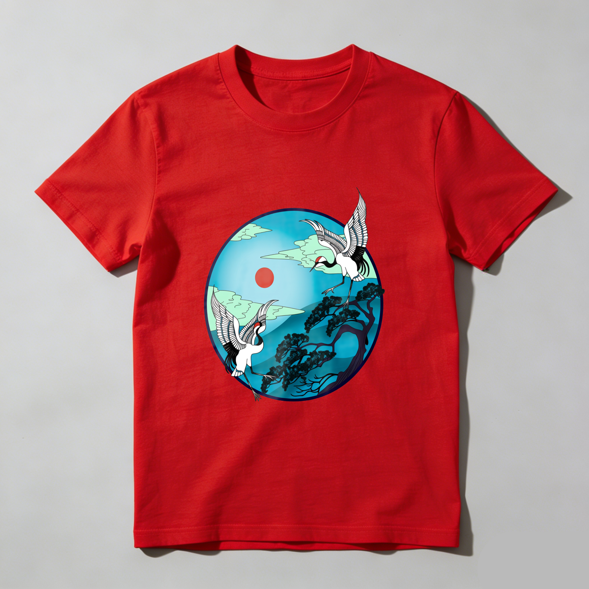 Crane Flying Over Mountain Landscape With Red Sun tshirt 100% cotton